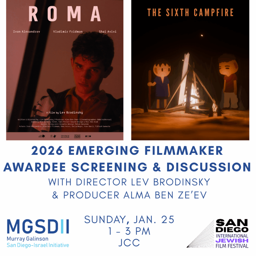 The 36th Annual San Diego International Jewish Film Festival will feature the two MGSDII Emerging Israeli Filmmaker award-winning shorts from the Tel Aviv International Student Film Festival: Roma by Lev Brodinsky and Alma Ben Ze’ev, and The Sixth Campfire by Lior Wigderson and Tomer Hadad.