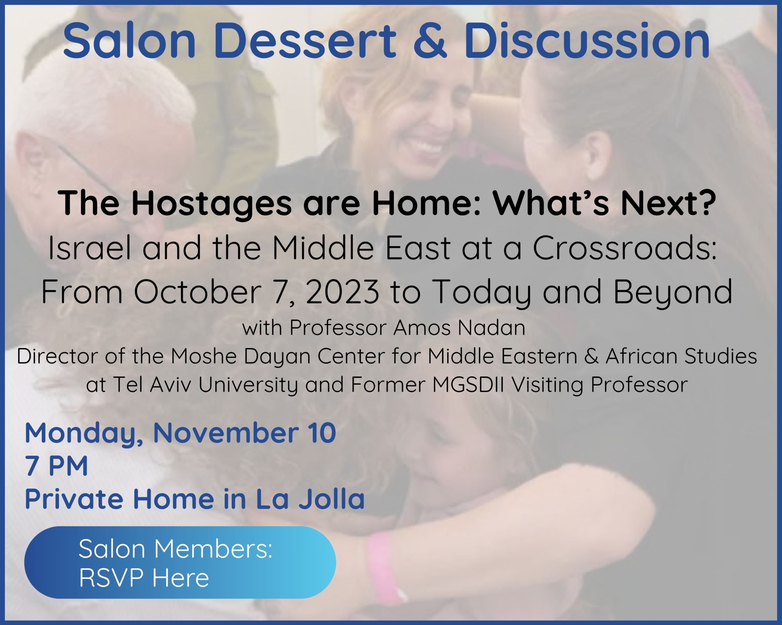 Salon Member Dessert & Discussion The Hostages are Home: What's Next? Israel and the Middle East at a Crossroads: From October 7 to Today and Beyond Monday, November 10, 2025 7:00 PM Private Home in La Jolla RSVP early to ensure you spot. Attendance is limited. This event is only open to Salon Members. […]